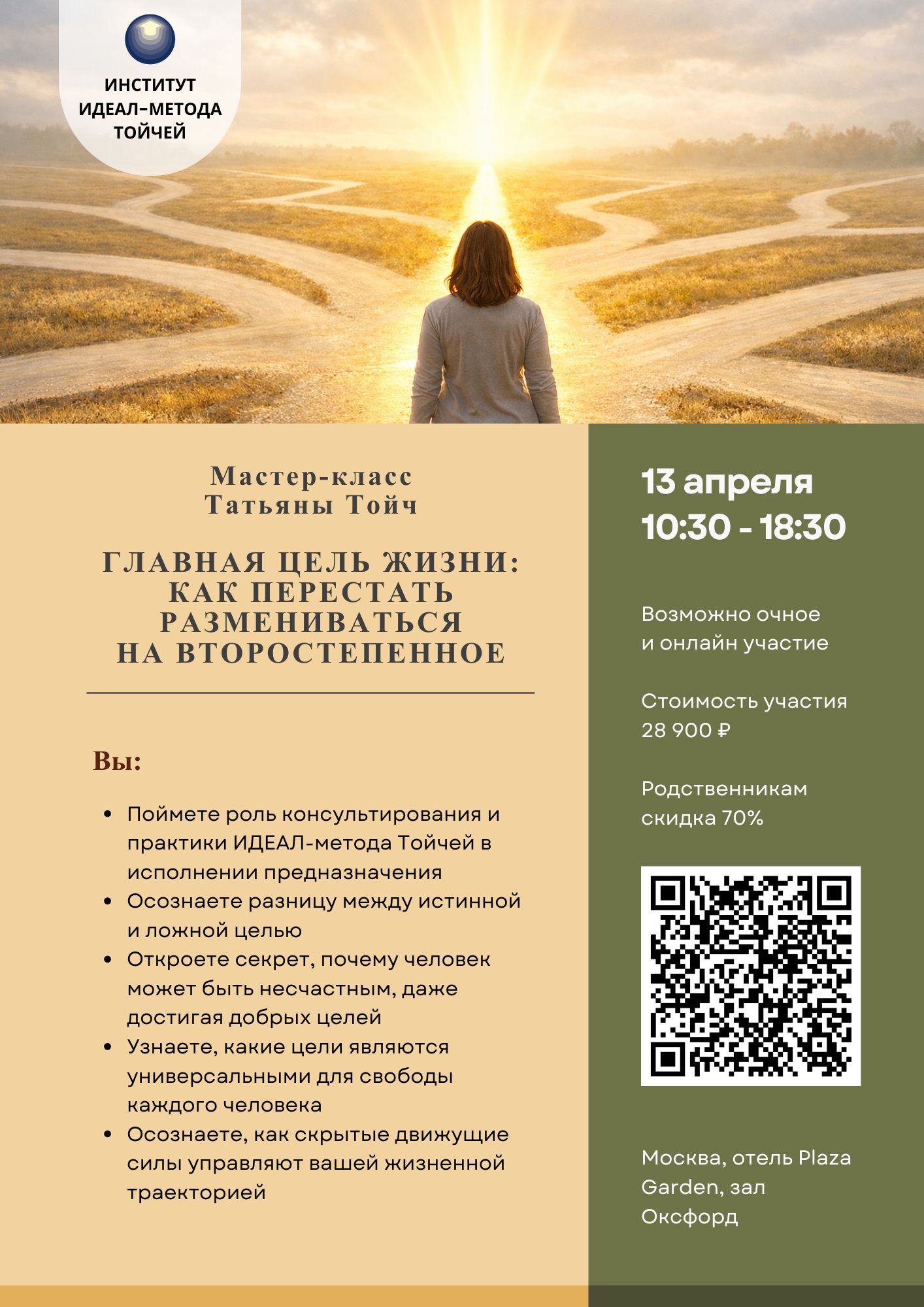 🔸 13 апреля | Мастер-класс «Главная цель жизни: как перестать размениваться на второстепенное».