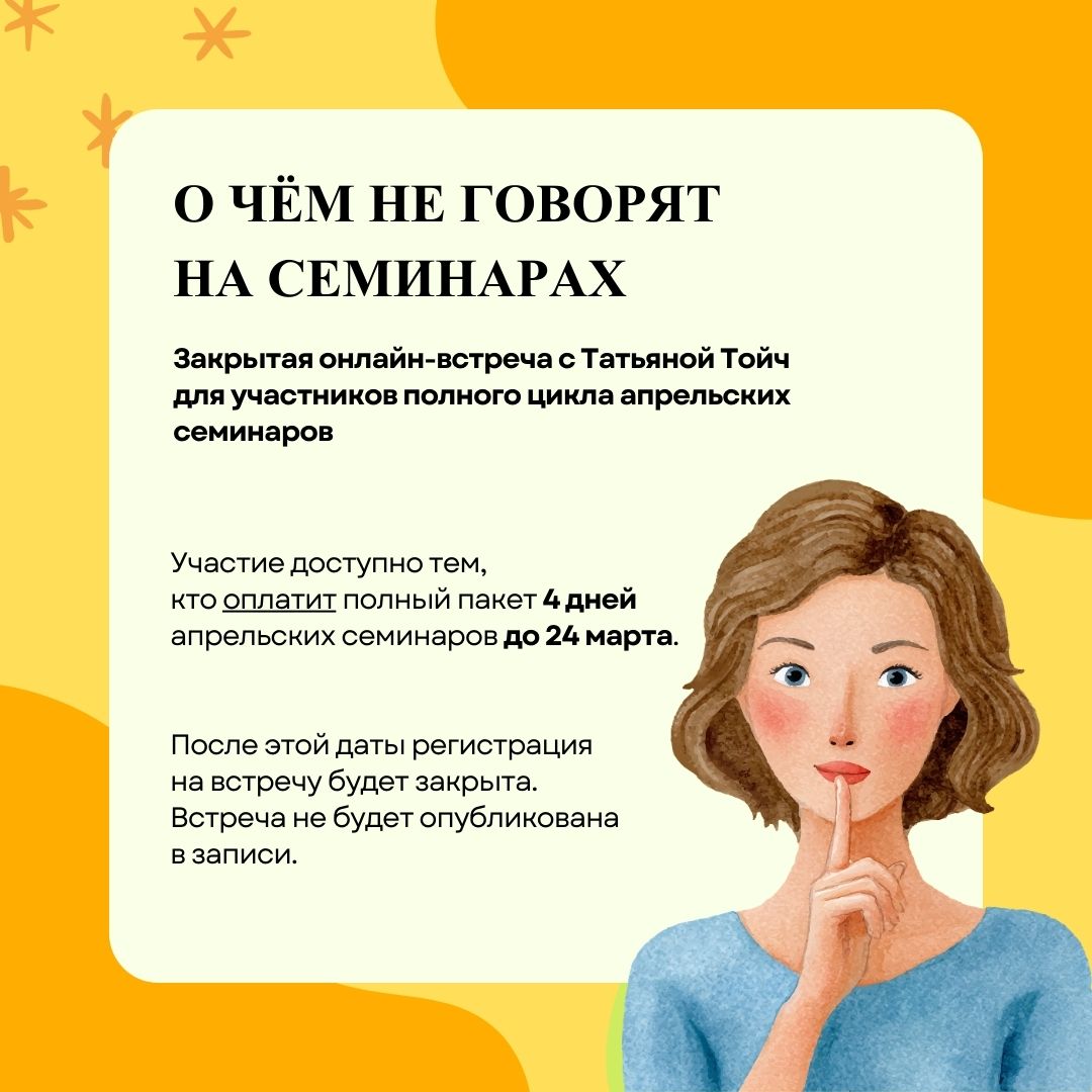 Тем, кто оплатит полный пакет 4 дней семинаров до 24 марта, мы дарим подарок — участие в закрытой онлайн-встрече с Татьяной Тойч «О чём не говорят на семинарах».