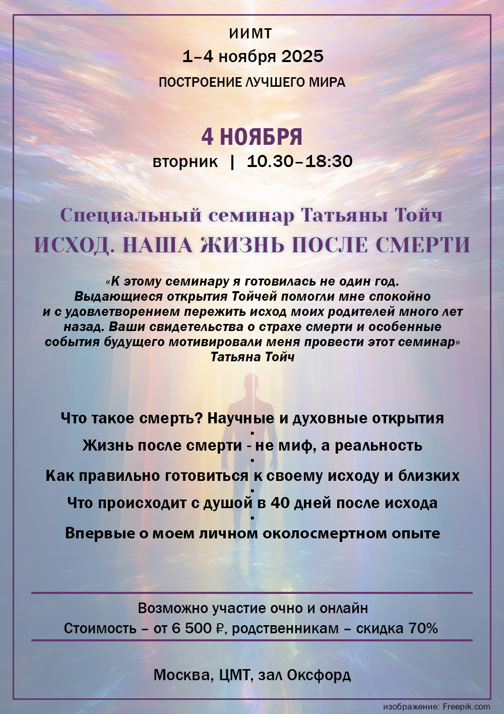 К этому семинару я готовилась не один год. Выдающиеся открытия Тойчей помогли мне спокойно и с удовлетворением пережить исход моих родителей 13 лет назад. Ваши свидетельства на Курсе веры и бесстрашия о страхе смерти в 98% случаев и особенные события будущего мотивировали меня без промедления провести этот семинар.
